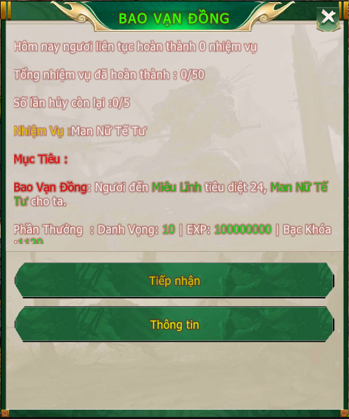 Nhiệm vụ Bao Vạn Đồng là một trong những nhiệm vụ mang đến nhiều phần thưởng cho quý đồng đạo. Đồng đạo dễ dàng tham gia nhiệm vụ này vì điều kiện khá dễ dàng.