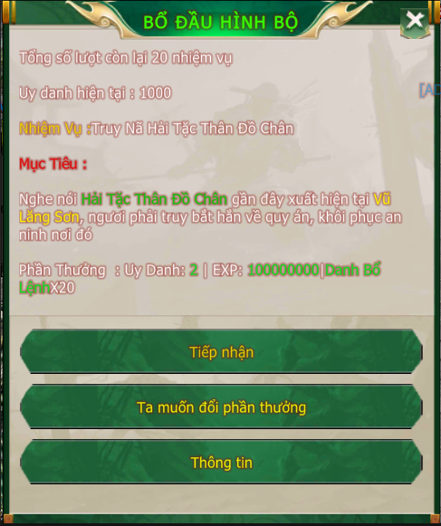 - Mỗi ngày nhận được 20 lần nhiệm vụ, tích lũy tối đa 36 lần.